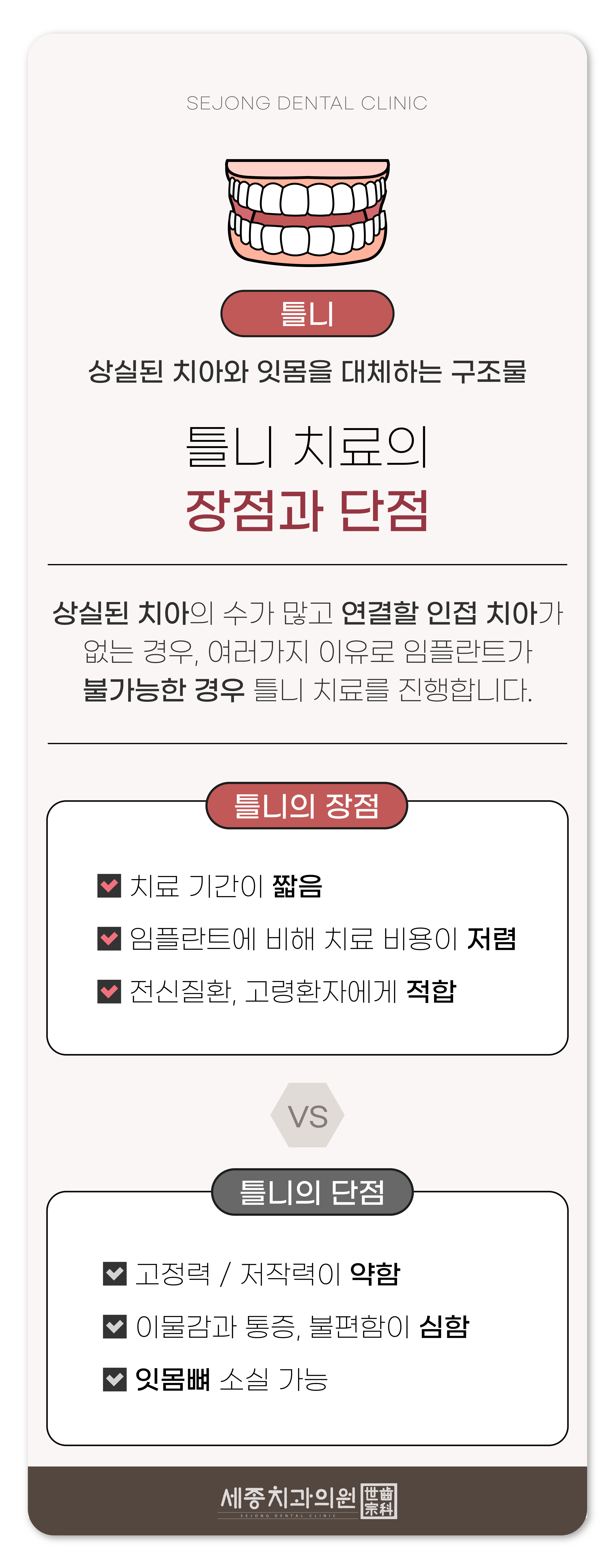 부산임플란트틀니치과 틀니는 의치 틀을 잇몸 위에 올리는 치료 방법입니다. ◆장점 짧은 치료 기간과 다른 치료보다 상대적으로 비용이 저렴하다는 장점이 있으며, 별도의 수술을 할 필요가 없어 전신 건강이 좋지 않거나 고령의 환자도 치료를 받을 수 있습니다. ◆단점 그러나 틀니는 잇몸에 고정되는 것이 아니라 잇몸 위에 얹는 원리이므로 고정력이 약한 점이 단점입니다. 틀니는 자연치아의 저작력에 비해 20% 수준 밖에 회복되지 않아 음식을 씹는데 제약이 생기며, 이물감과 불편함이 생기게 됩니다. 시간이 지나면 치아가 없는 잇몸뼈는 점점 흡수되어 사라지므로 주기적으로 틀니를 다시 조정해 주어야 하는 번거로움도 있습니다.