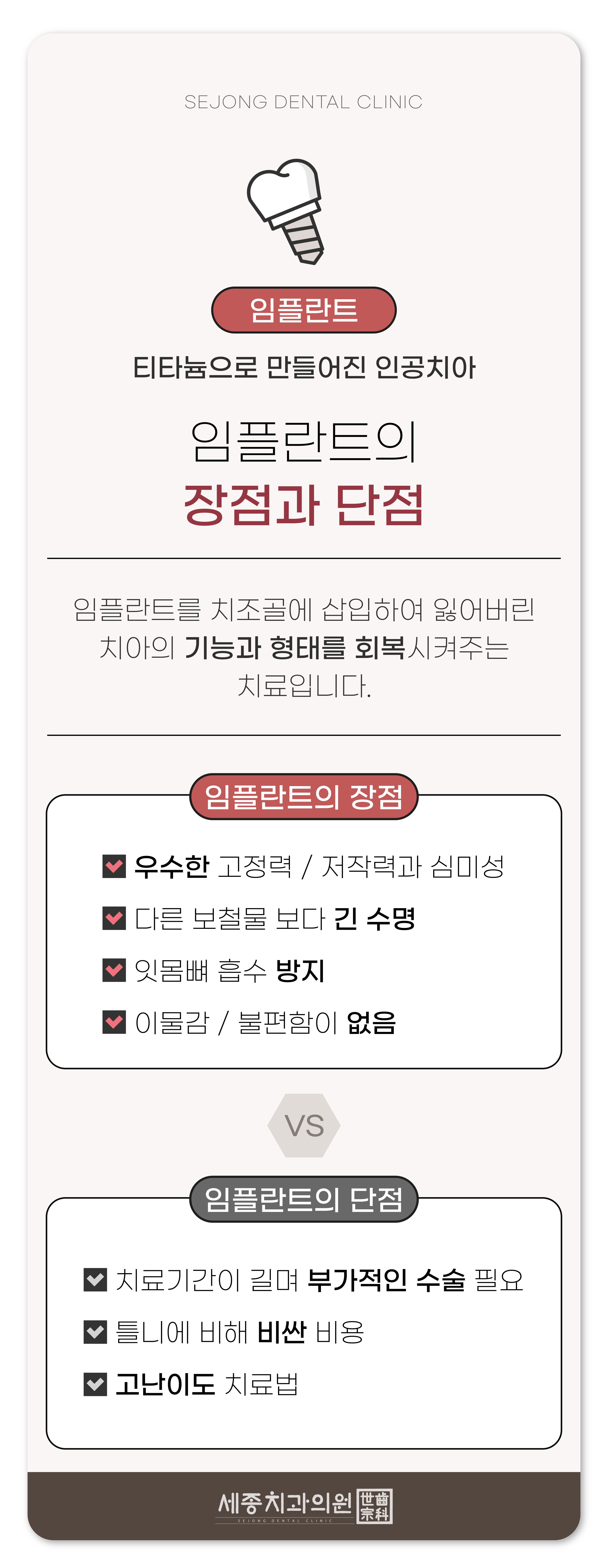 부산임플란트틀니치과 임플란트는 자연치아와 저작력과 심미성까지 매우 유사합니다. ◆장점 임플란트는 자연치아 기능을 거의 회복할 수 있고, 틀니에 비래 저작력이 5~7배나 강합니다. 그리고 임플란트 식립체를 잇몸이 잡고 있어 잇몸뼈 흡수도 막을 수 있습니다. ◆단점 그러나 임플란트는 치료 기간이 길고 치료 비용도 높다는 단점이 있습니다. 노약자나 전신질환(당뇨, 고혈압 등)이 있으면 임플란트 수술의 난이도가 어려워집니다.