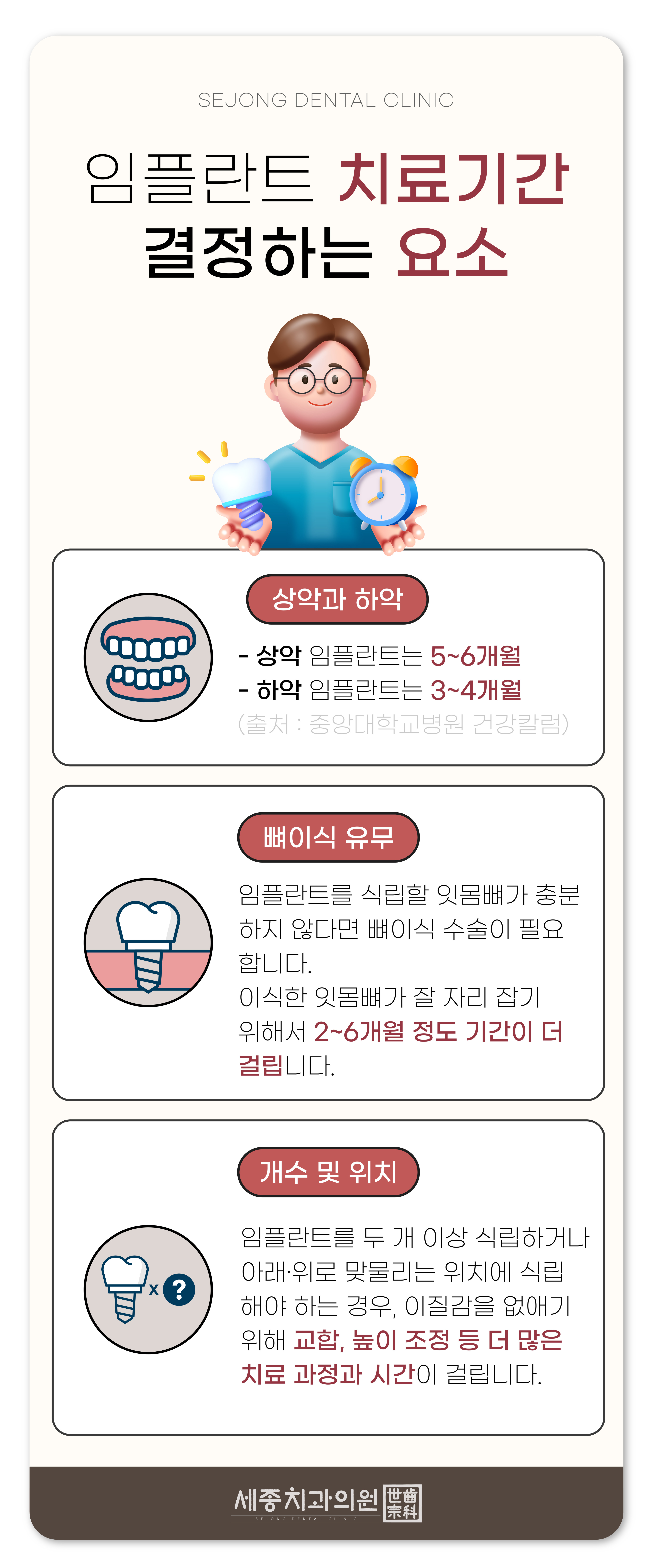 또 심을 임플란트 개수가 많아질수록 치료 기간이 길어지며, 식립 수술 전 부가 수술이 필요하면 그 만큼