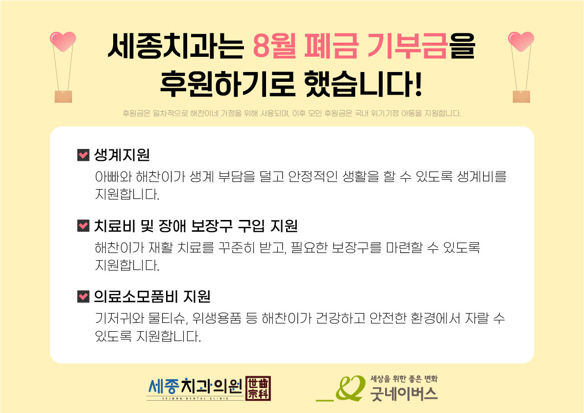 세종치과는 도움의 손길이 필요한 해찬이네 가정과 위기가정아동들을 위해 5월 폐금기부를 했습니다.