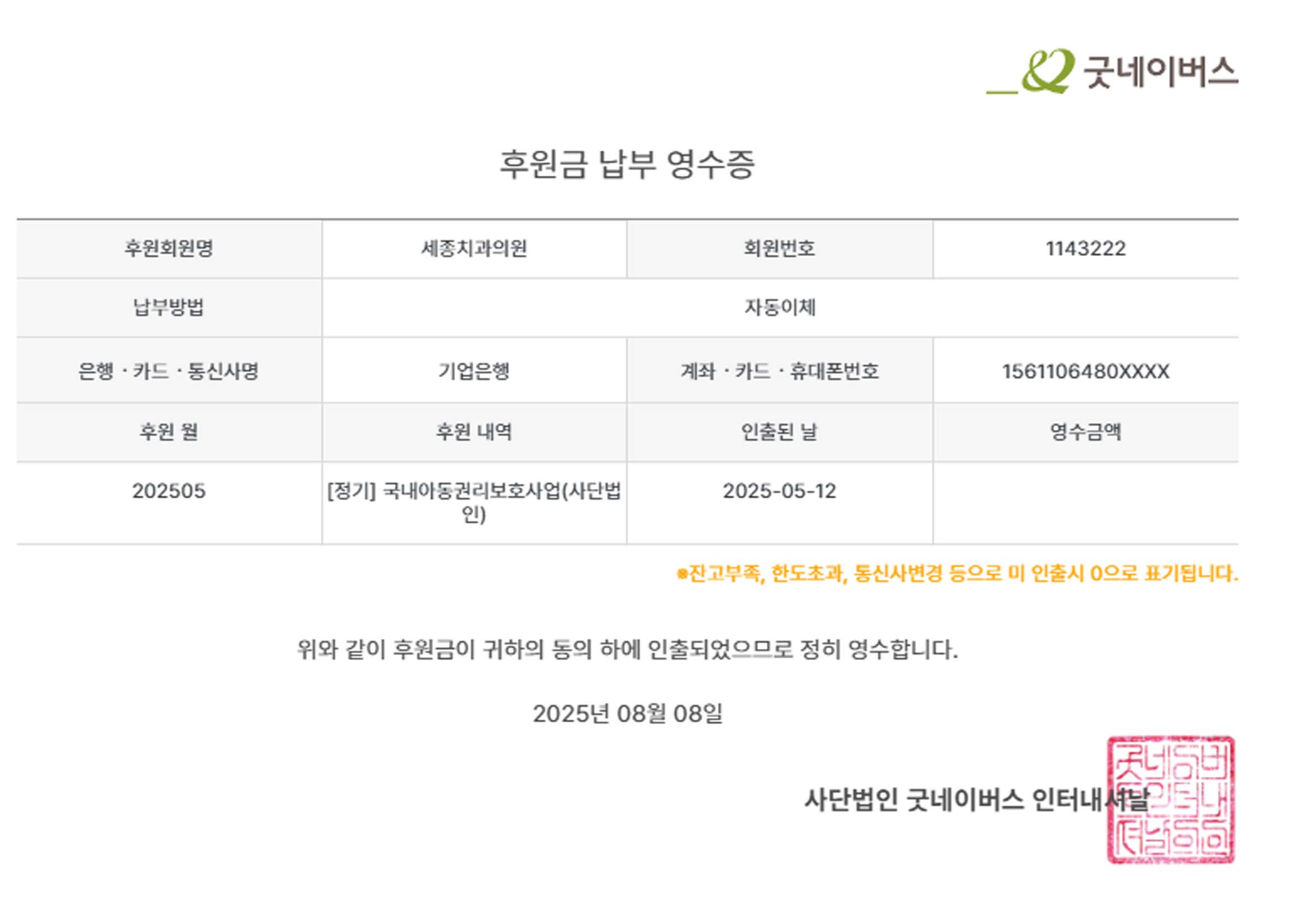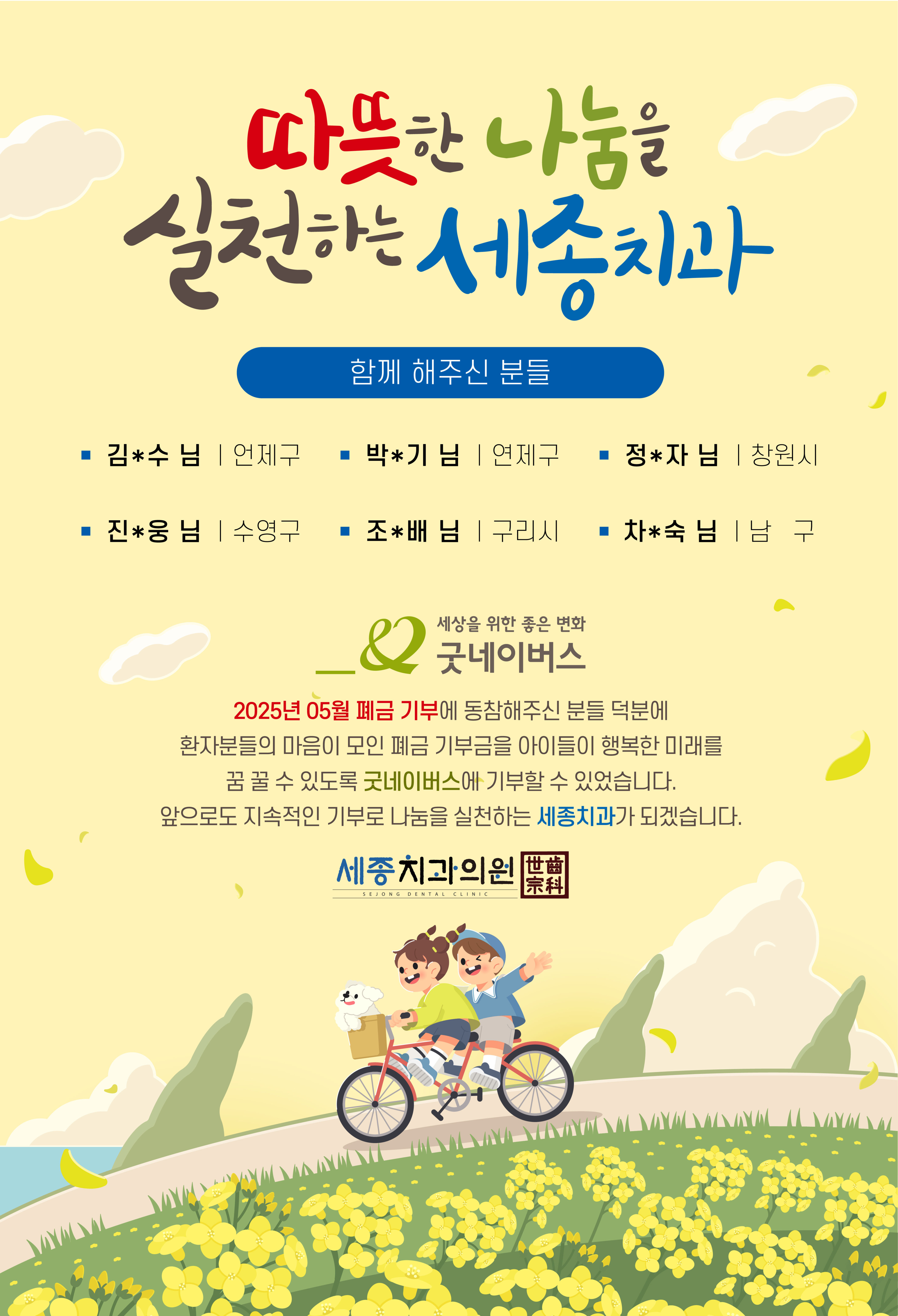 2025년 5월 세종치과 폐금기부에 동참해주신 여섯 명의 환자분들께 진심으로 감사드립니다.