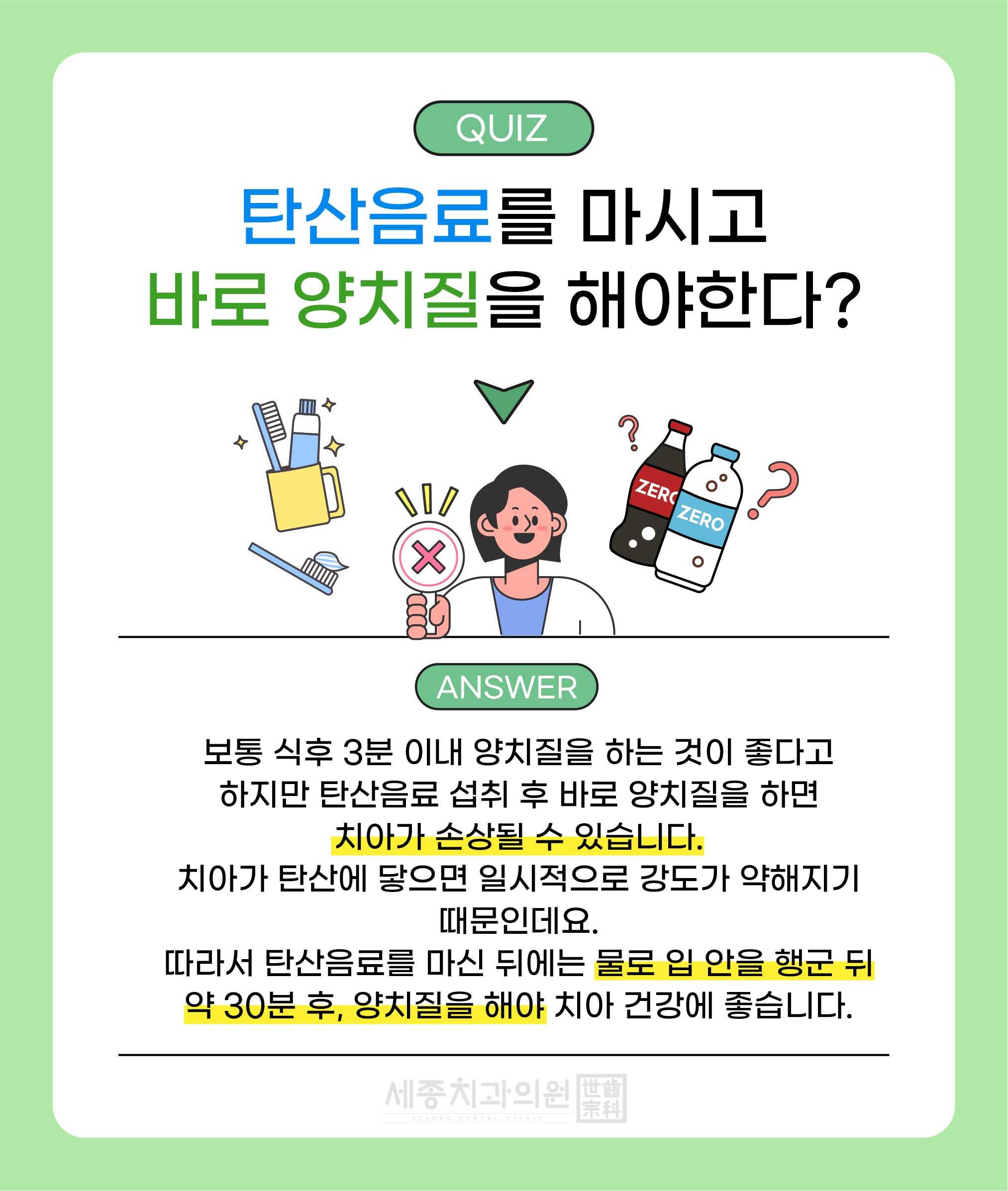Q. 탄산음료를 마시고 바로 양치질을 해야 한다?