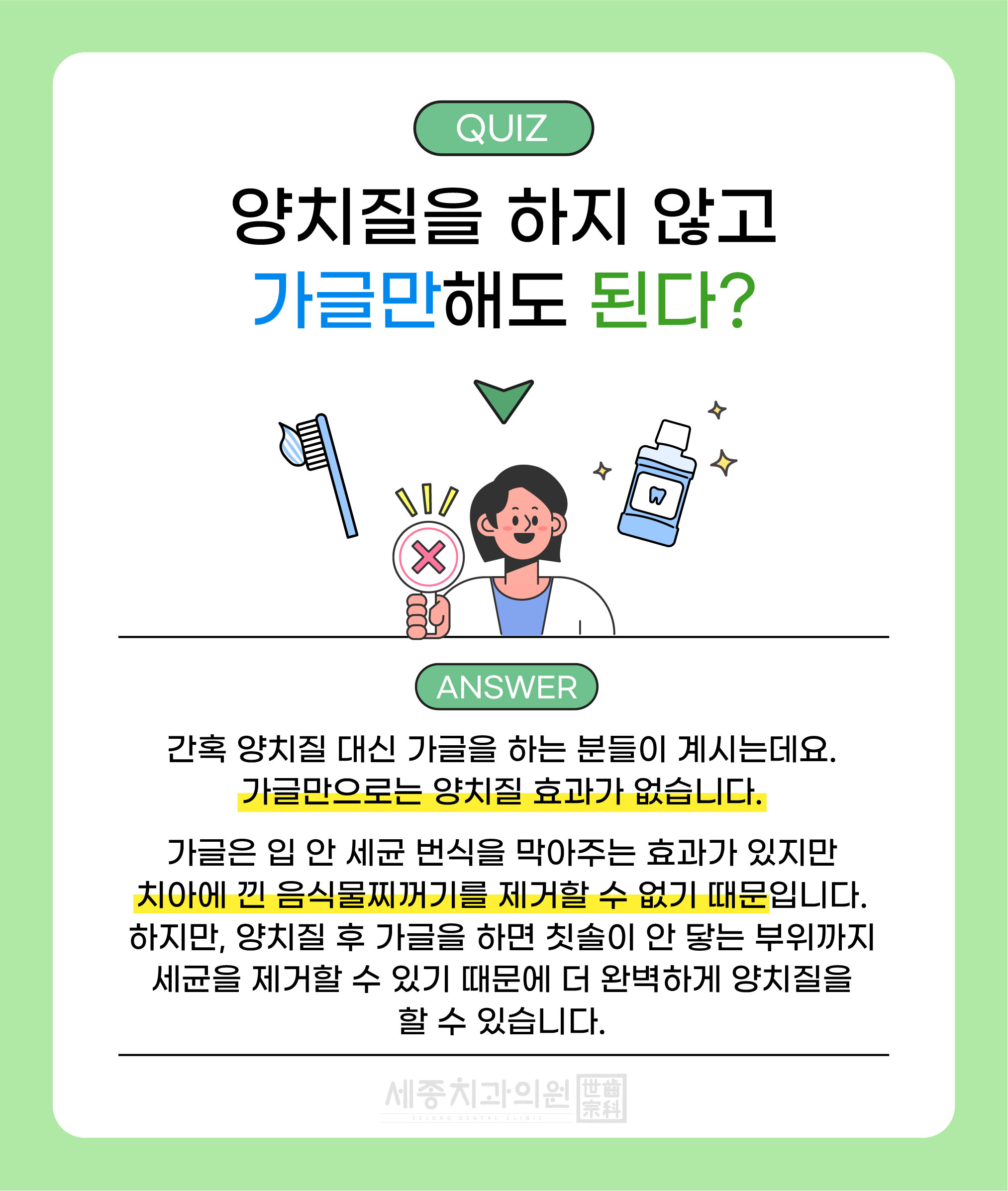 가글은 입안 세균 번식을 막아주는 효과가 있지만, 치아에 낀 음식물 찌꺼기를 제거할 수 없기 때문입니다.