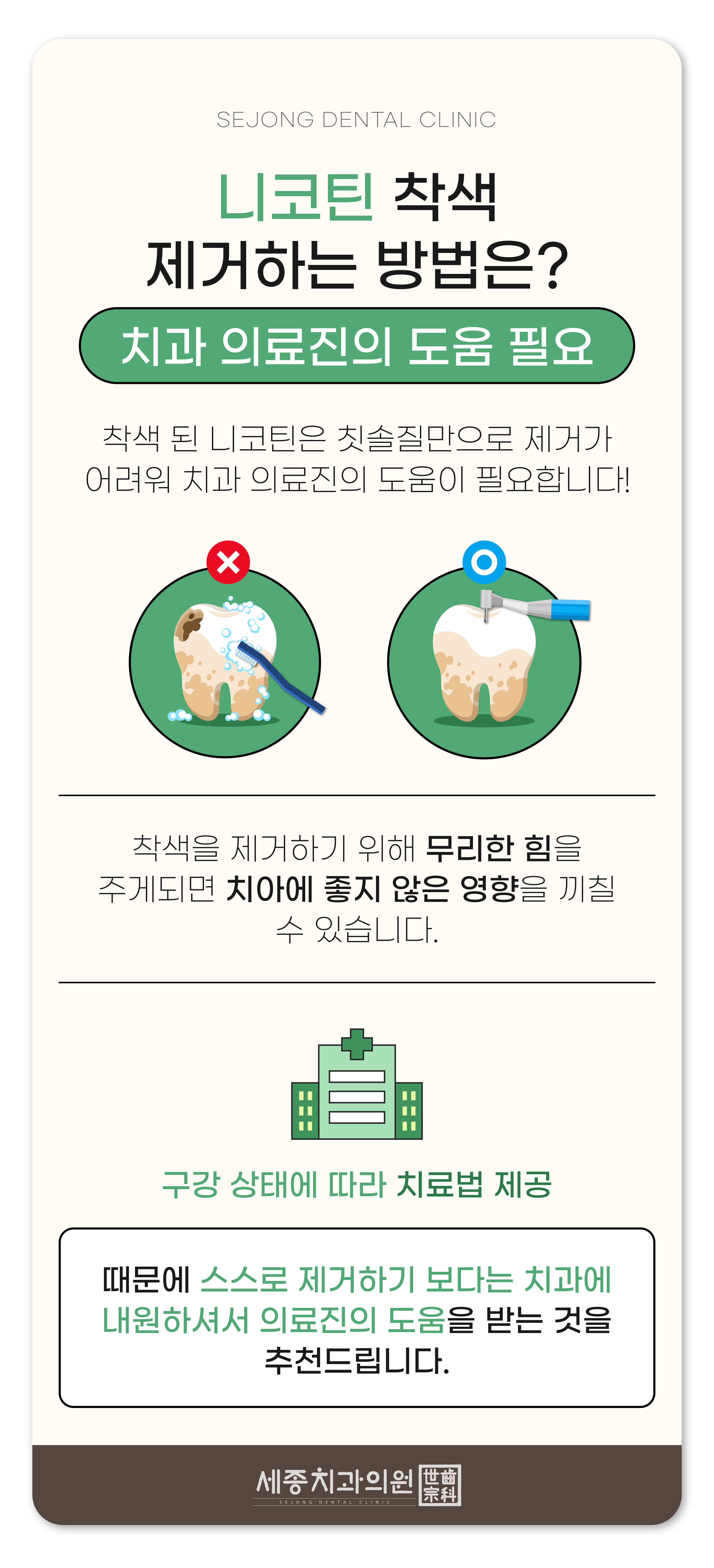흡연을 하신다면 치과에 더 자주 내원해서 니코틴 착색 제거 치료뿐 아니 치아 건강 상태를 점검받아야 합니다.